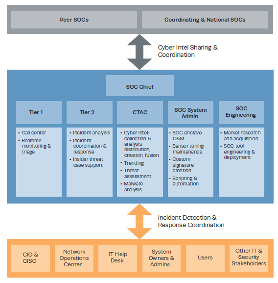 A key component of a SOC is the cyber threat analysis cell (CTAC). The following figure from the Zimmerman manual illustrates how a CTAC functions within the SOC (2014).